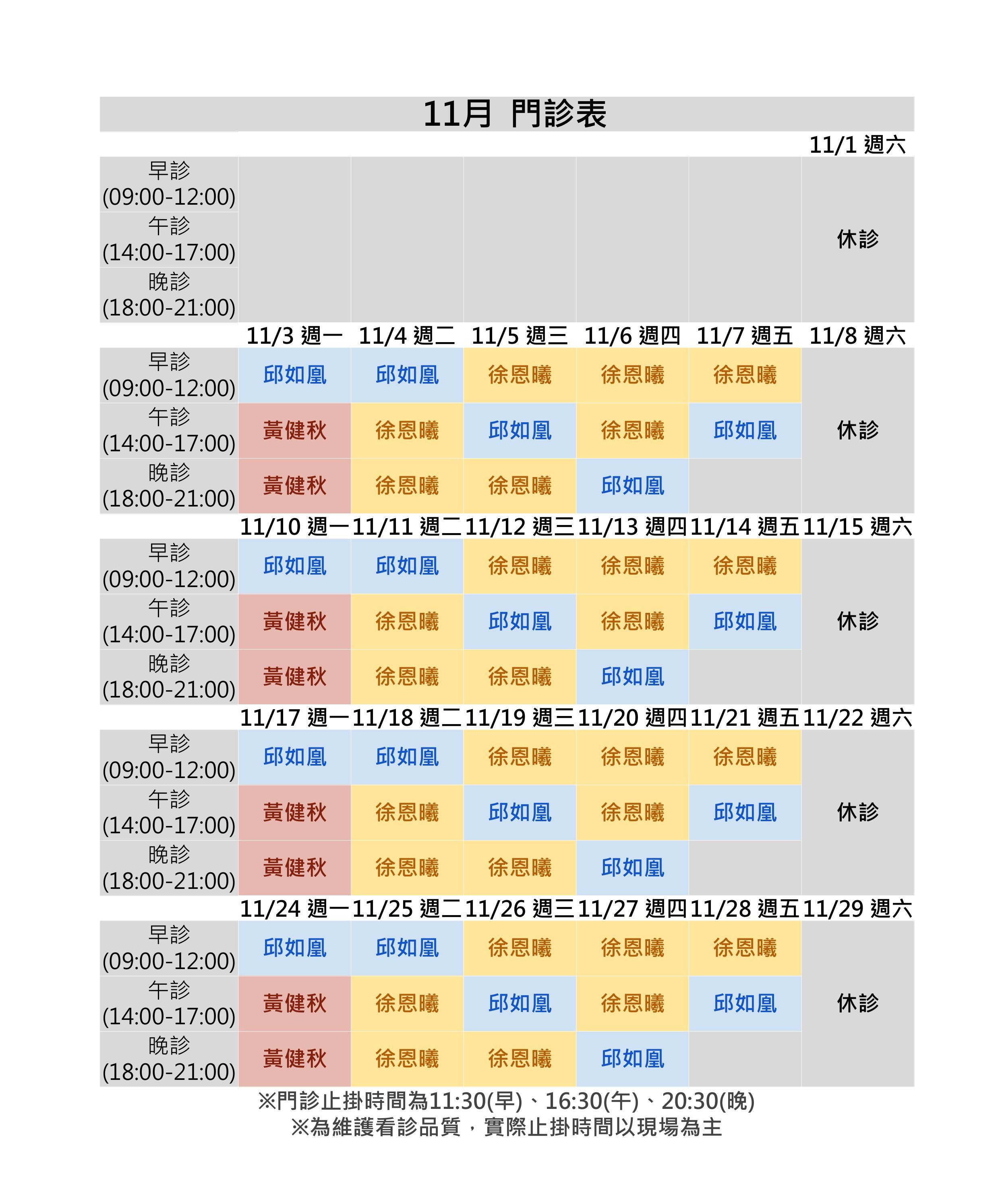 2025 / 11月 門診時間表 | 台南復健科
